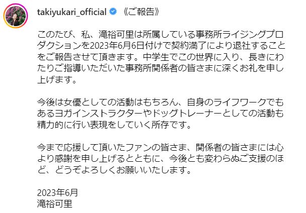 滝さんは「このたび、私、滝裕可里は所属している事務所ライジングプロダクションを2023年6月6日付けで契約満了により退社することをご報告させて頂きます」と投稿し「中学生でこの世界に入り、長きにわたりご指導いただいた事務所関係者の皆さまに深くお礼を申し上げます」と今までの感謝を伝えています。