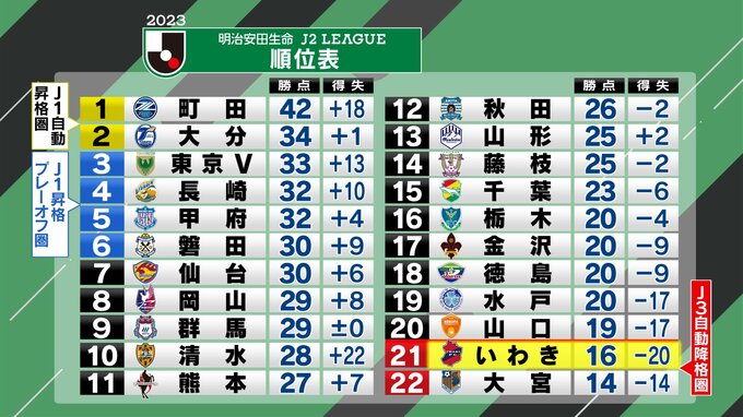 いわきFCは敗れたため、降格圏の21位のままとなっています。