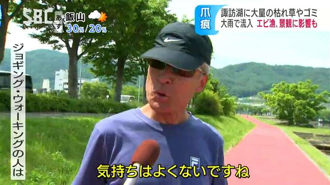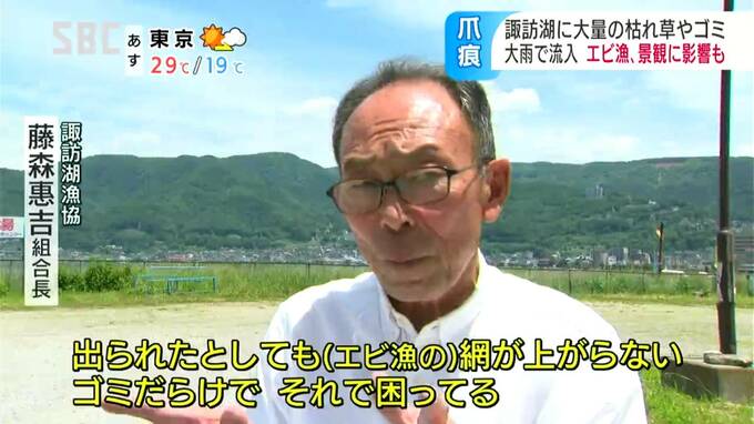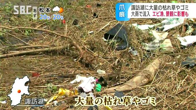 2日の大雨で川から流れ込んだゴミが風にあおられて漂着したもので、諏訪湖漁協では最盛期を迎えるテナガエビ漁への影響を心配しています。