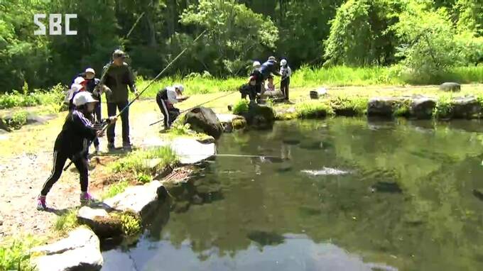 釣りを体験したのは、開田(かいだ)小学校の3、4年生およそ20人で、地元の川に住む魚を教えてもらい、さっそく釣り堀でイワナ釣りに挑戦しました。
