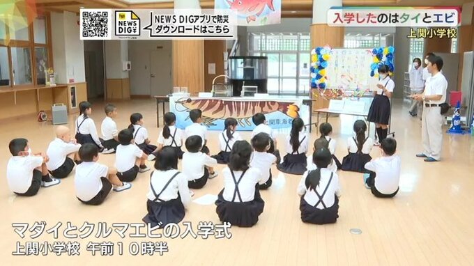 上関小学校であったのは、「マダイとクルマエビの入学式」です。