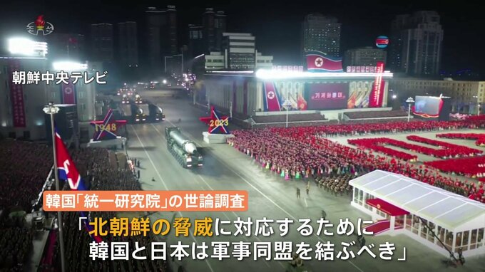 韓国の世論調査で、北朝鮮や中国に対応するための日本と韓国の同盟に同意すると答えた人が5割を超えたことが分かりました。韓国政府傘下の「統一研究院」がきょう発表した世論調査の結果によりますと、「北朝鮮の…