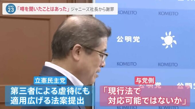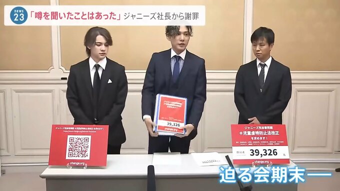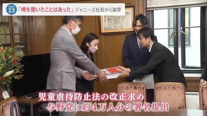 元ジャニーズJr.の男性らが、与野党に児童虐待防止法の改正を求める署名を提出しました。また、提出者の一人でもある橋田さんは先月、藤島ジュリー景子社長と面会し「性加害の噂を聞いたことはあった」と説明を受けていたことが分かりました。