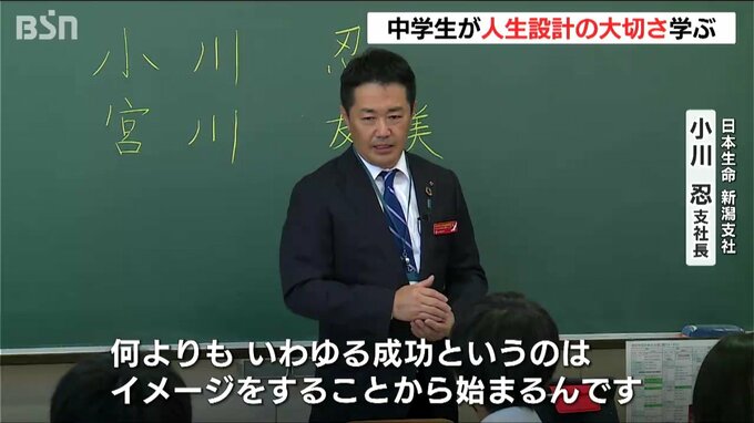 新潟市東区の石山中学校で行われた出前授業。新潟県と日本生命が結ぶ包括連携協定の取り組みのひとつとして、日本生命新潟支社の小川忍支社長が生徒たちに人生設計の重要性について話しました。