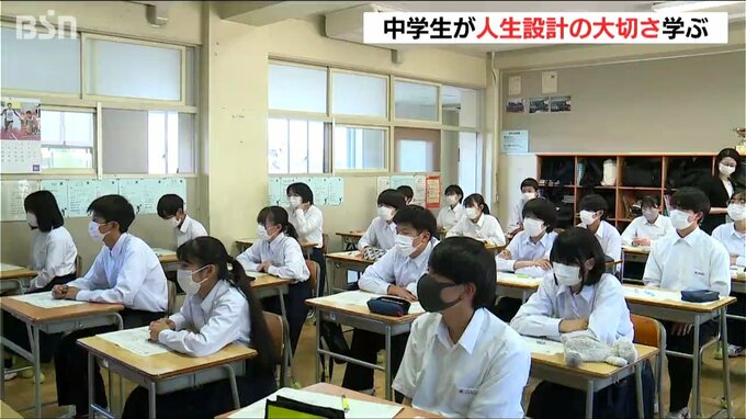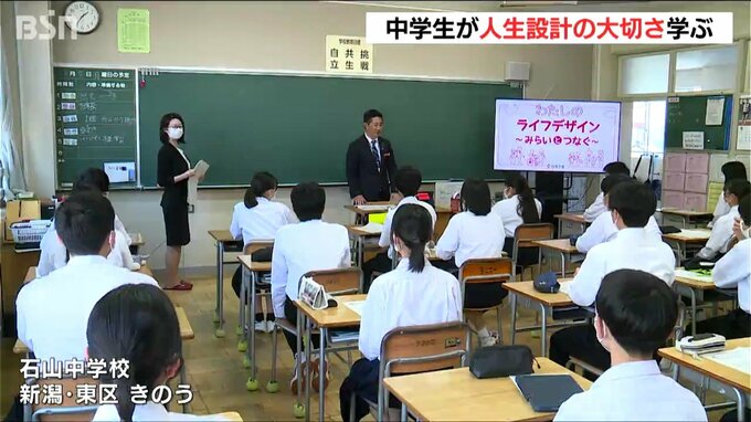 新潟市の中学校でライフプランニング=人生設計について学ぶ出前授業が行われ、将来を考える大切さを学びました。