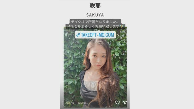 咲耶さんはインスタグラムのストリーズで、「テイクオフ所属となりました。今後ともよろしくお願い致します」とつづっています。事務所の公式ホームページには、2025年公開予定の映画「粛々のモリ」に、準主役で出演することが伝えられています。