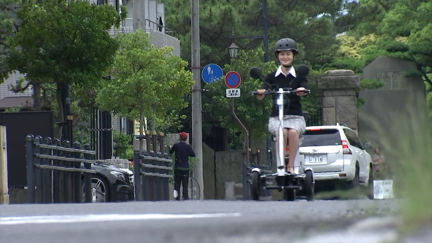 スクーターのように女性がスカート姿で気軽に楽しめます。記者が早速乗って見ました。