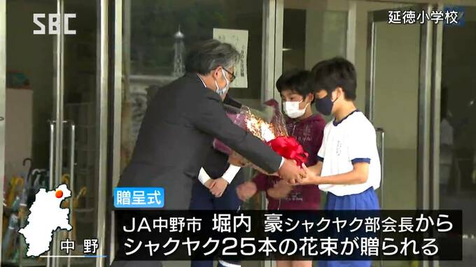 このうち中野市の延徳(えんとく)小学校には、JA中野市の堀内豪(ほりうち・つよし)シャクヤク部会長が訪れ、代表の児童に25本のシャクヤクの花束を手渡しました。