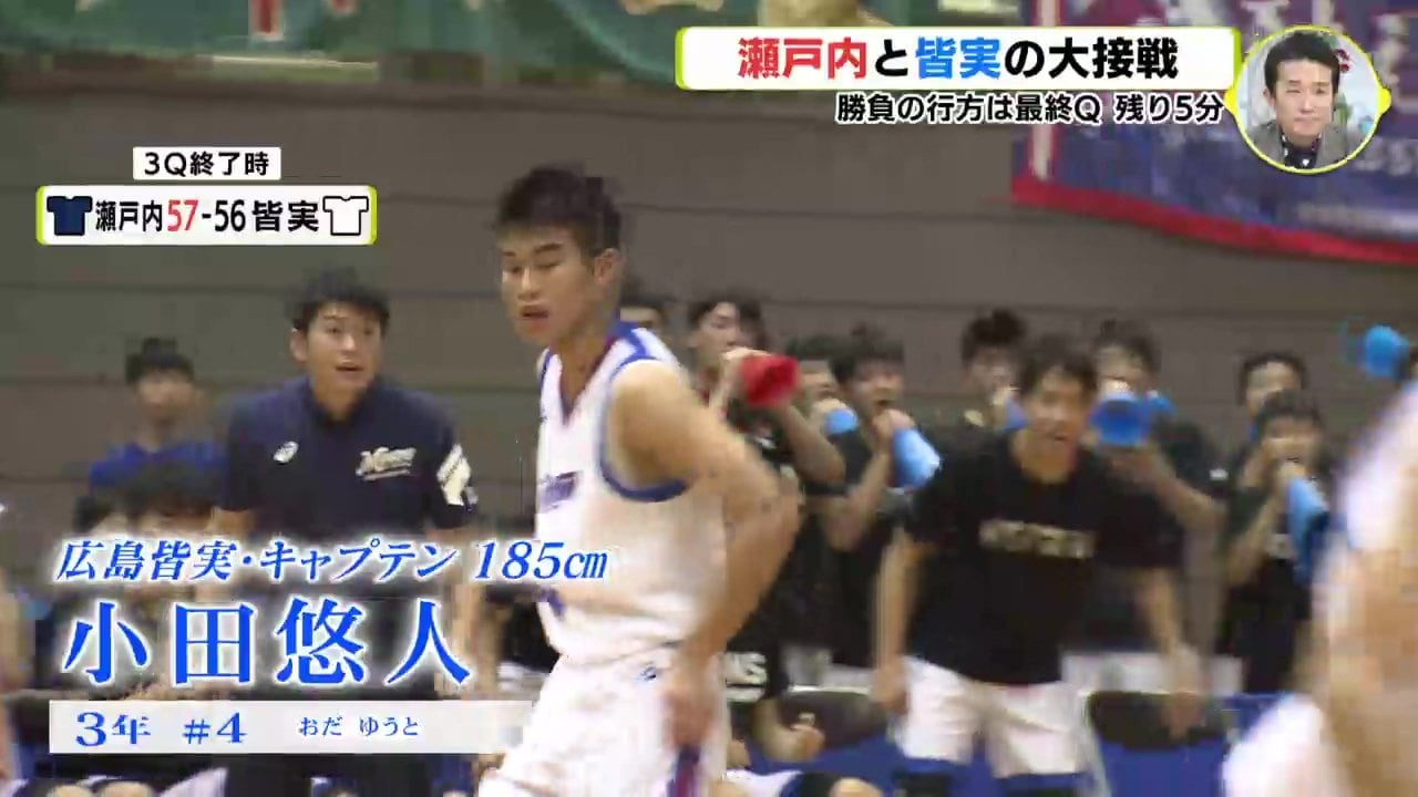 ただ、それでも瀬戸内は、濱田の3ポイントで再逆転に成功。そんな手に汗握る終盤の攻防の中で存在感を強めたのが、皆実のエース・中村英司 でした。外から、中からと多彩なパターンで、第4クォーターだけで14得点。最終盤で瀬戸内を突き放し、試合終了。