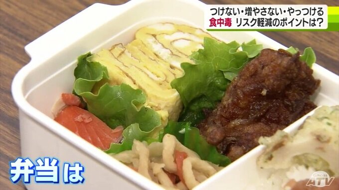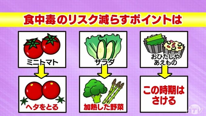 お弁当の彩りによく使われることが多いミニトマト。ヘタがついた部分は洗っても菌が残りやすく、ヘタをとったあとに水洗いして水気をふき取る。また、キュウリやレタスなどの生野菜は、加熱したブロッコリーやアスパラガスなどに置き換えることでリスクを減らすことができます。