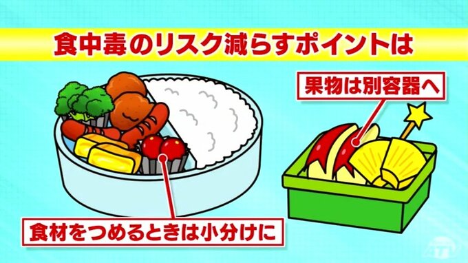 さらに食材を弁当箱などに詰めるときはカップやアルミホイルなどで仕切って小分けにし、くだものは別の容器にいれるとさらに効果的です。