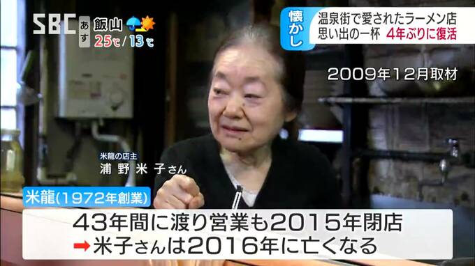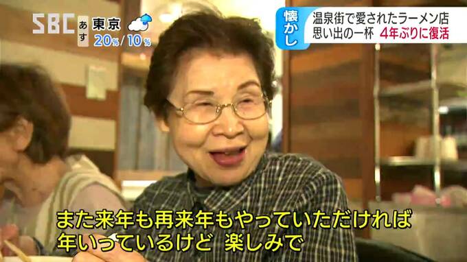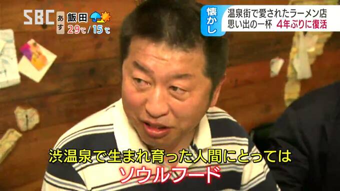 【渋温泉旅館組合 山田和由さん】「(米龍のラーメンは)人柄がラーメンにも出ていた。非常におおらかな感じ。でも、いっぺん食べたら忘れられないクセになる味なので、そういったことは引き継いでいければなと思う。おばちゃん(米子さん)も喜んでいるのではと勝手に思っているので、これからも続けていきたい」