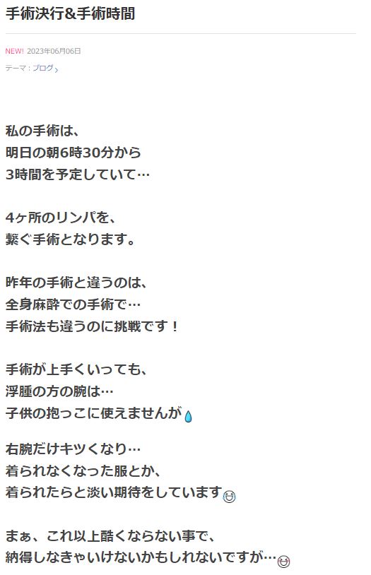 だいたさんは先月11日に「手術前の検査へ」とのタイトルで、先月12日には「気が重い手術」とのタイトルでブログを更新して、手の浮腫にまつわる症状などについて記しており、長く悩まされてきた浮腫に対する手術に臨むことになります。