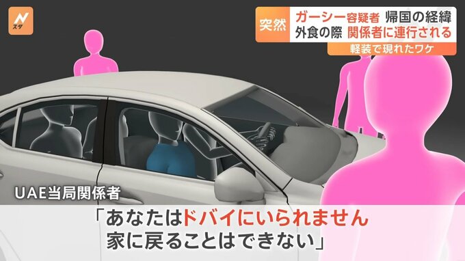 関係者によると、ガーシー容疑者が連行されたのは現地6月3日の午後10時。ガーシー容疑者ら4人が食事に出かけようと車に乗ったところ、突然、当局の関係者が立ちふさがったといいます。そして…