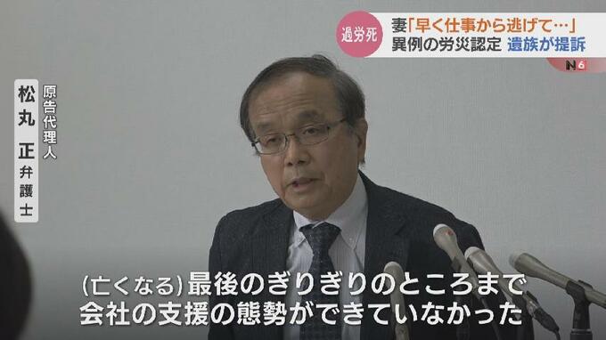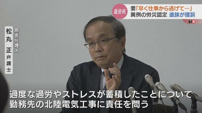 原告代理人 松丸正 弁護士:「長時間労働が生じていたとしても最後のぎりぎりのところまで、会社の支援のしっかりした体制ができていなかった。その結果として100時間を超える長時間労働が生まれている。過度な過労やストレスが蓄積したことについての勤務先の北陸電気工事に責任を問う」