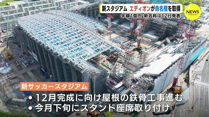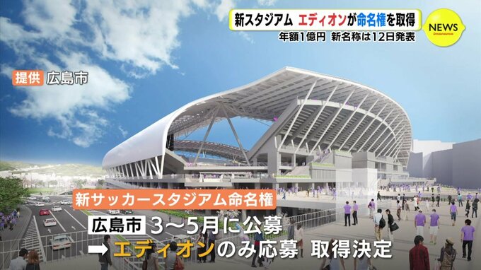 広島市で建設が進む新たなサッカースタジアムの命名権を家電量販店のエディオンが取得しました。命名権料は、年額で1億円です。
