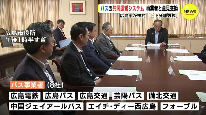 広島市が検討しているバスの「上下分離方式」による共同運営システムについて、バス事業者8社のトップと松井市長が6日、意見交換しました。