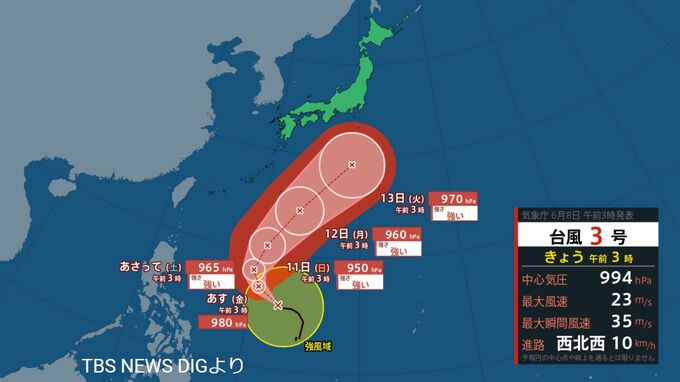 気象庁によりますと、台風3号は、8日午前3時現在フィリピンの東を、1時間におよそ10キロの速さで西北西へ進んでいます。