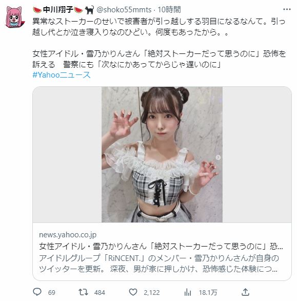 深夜、男が家に押しかけ、恐怖を感じた体験を報告した、アイドルグループ「RiNCENT.」のメンバー・雪乃かりんさんの記事を引用し、自身のストーカー被害の体験も交えて、ツイートしました。