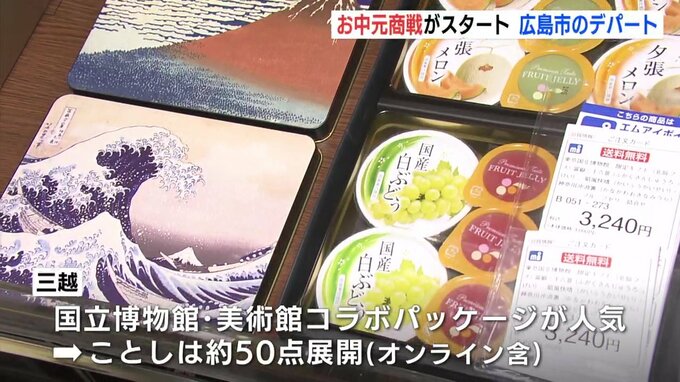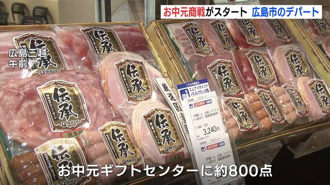 広島市の広島三越には、7日、お中元ギフトセンターが設置され、ハム・乾麺・コーヒーなど、およそ800点が並びました。