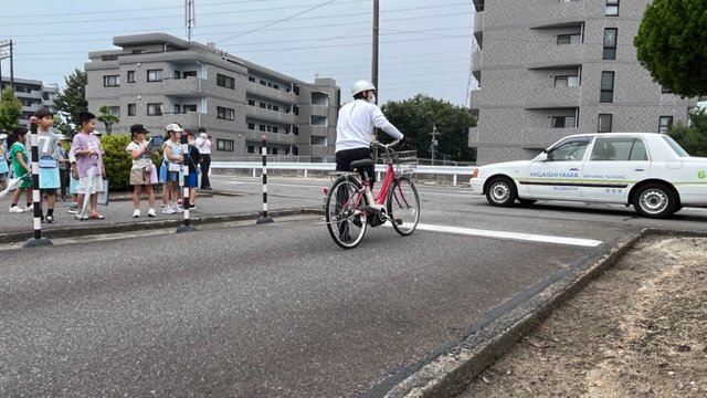 6日、名東区にある東山自動車学校で教習コースを使った自転車に関する交通安全教室が行われ前山小学校の3年生児童32人が参加しました。子どもたちは車はすぐに止まれないことや交差点で左右の確認をせずに渡ると危険なことなどを学びました。