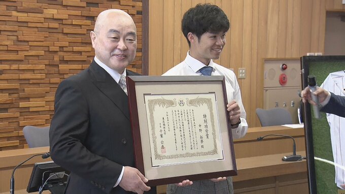 東北出身でWBCでも活躍した阪神タイガース 中野拓夢選手が、母校の東北福祉大学で表彰を受けました。
