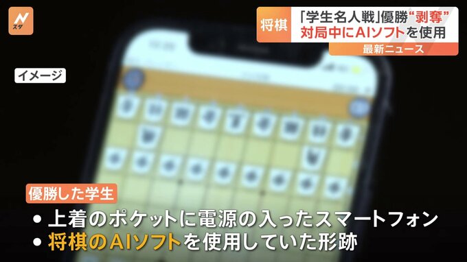 今月4日に行われた将棋の「学生名人戦」で優勝した学生が、対局中に将棋のAIソフトを使っていたことが判明し、失格になっていたことがわかりました。全日本学生将棋連盟によりますと、今月3日と4日の2日間、東京で…
