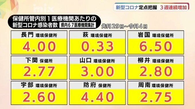 山口県が8日、新型コロナウイルスの定点把握による感染状況を発表しました。県によりますと、5月29日から6月4日までの1週間に、67の医療機関で合わせて220人の感染が確認されました。1医療機関あたりの感染者は3.2…
