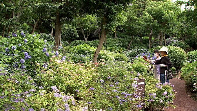 静岡県伊東市の観光施設では、梅雨を彩るアジサイの花が咲き始め、観光客の目を楽しませています。