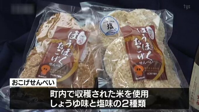 「おこげせんべい」には、豊北町で収穫された米が使われ、しょうゆ味と塩味の2種類があります。