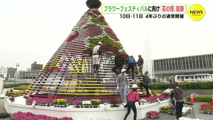 今週末に開催される「ひろしまフラワーフェスティバル」に向けた準備が進められています。8日は、「花の塔」に花のすえ付けが行われました。米田健太郎 記者「花の塔の設置場所です。塔の上から順番に次々と花がす…
