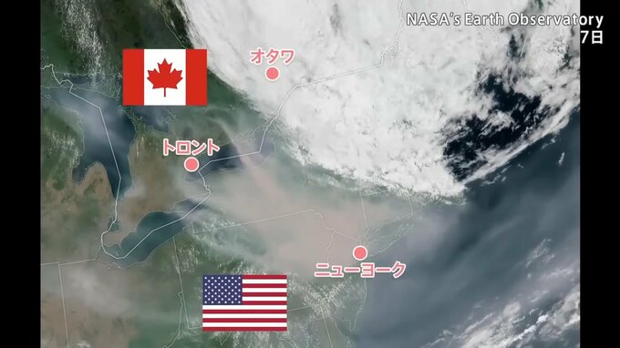 衛星写真でも、カナダからニューヨーク方面に茶色い煙の帯が流れ込んでいるのがわかります。NASAなどによると、本来海の方向に流れるはずの煙が、低気圧などの気圧配置の影響でニューヨーク方面に留まったのだといいます。