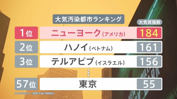 スイスの空気清浄機メーカー「IQエアー」によると、ニューヨークは現在、世界の主要都市の中で最も空気の悪い都市となっています。