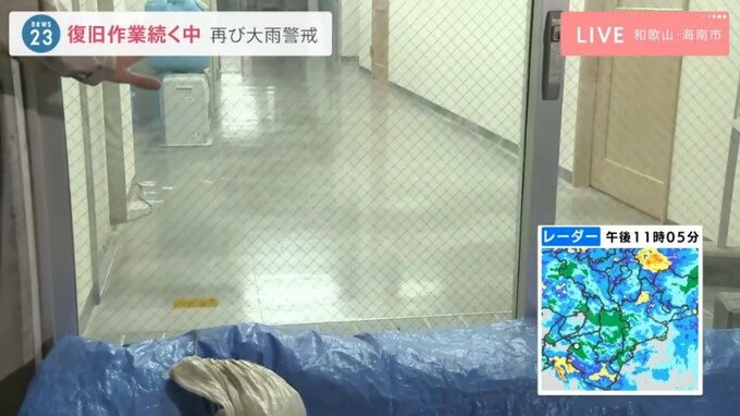 また、その水は建物の中にも流れ込みました。こちらの建物、ガラスに黄色いテープが貼ってあります。床から25センチほどですが、このあたりまで浸水したといいます。現在、廊下は綺麗になっていますが、今日まで1週間近くかけてこの状態にしたそうです。ただ、そのタイミングで今夜の大雨予報、ブルーシートや土のうを置いて、浸水対策をしています。担当者は念には念をと話していました。