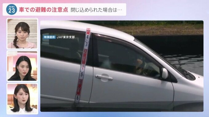 JAFの実験映像では、冠水した道路に入ってしまって車が動かなくなった場合に、水深60センチを超えると、内側からドアを開けることができなくなってしまいます。そうなると、窓から脱出するしかないわけです。