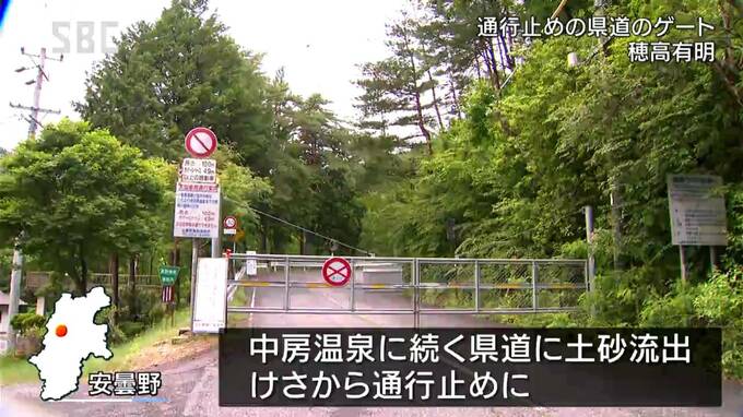 前線や低気圧の影響で、県内はきのう夕方から中部や南部を中心に大雨となり、安曇野市では中房(なかぶさ)温泉に続く県道に土砂が流出し、けさ6時から通行できなくなっています。