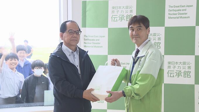 福島県双葉町の「伝承館」の入館者が20万人に到達し、来館者に記念品が手渡されました。