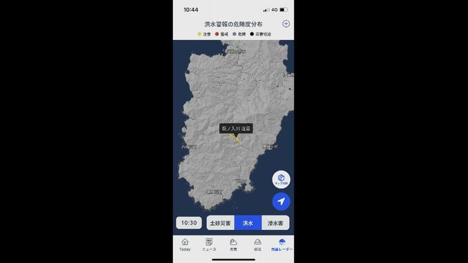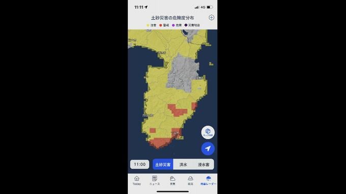 また、アプリでは気象庁の危険度マップ「キキクル」の情報もリアルタイムで映し出されます。ここでは土砂災害などの危険性を確認できます。例えばこれは、9日午前11時の情報ですが、静岡県の伊豆半島にオレンジの表示、土砂災害の警戒情報が出されていました。