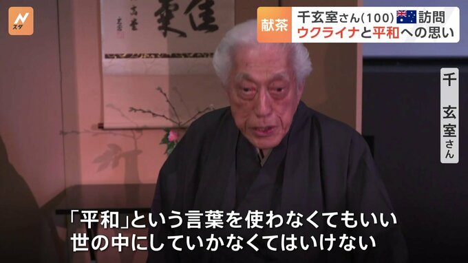 ことし100歳を迎えた茶道の裏千家15代家元の千玄室さんが、オーストラリアでお茶を披露しました。戦争を体験した世代として「ウクライナの戦争を終わらせたい」との思いも語っています。千利休から数えて15代目の…