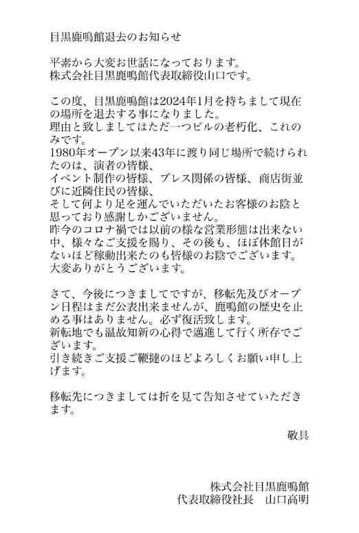 また「今後につきましてですが、移転先及びオープン日程はまだ公表出来ませんが、鹿鳴館の歴史を止める事はありません。必ず復活致します」とし「移転先につきましては折を見て告知させていただきます」と知らせています。