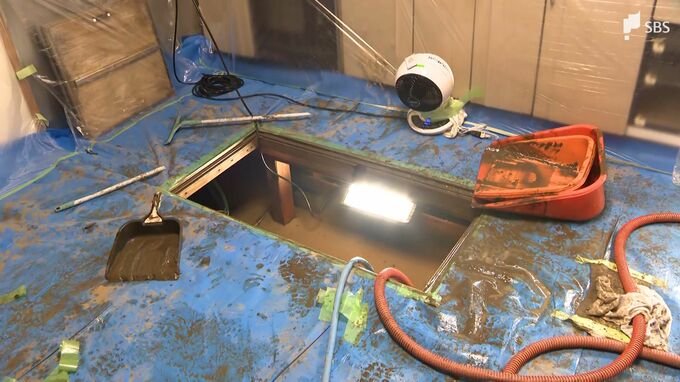 「今は水を逆に(床下に)入れて泥と一緒に吸い上げている。泥が下で固まってしまったので、水を一緒に入れて、泥ごと吸い上げているような状況」
