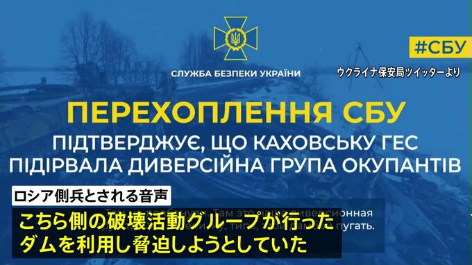 ウクライナ保安局は決壊した南部のダムについて、ロシア側が爆破したことを示す通話を傍受したとして音声を公開しました。ロシア側兵とされる音声「こちら側の破壊活動グループが行った。ダムを利用し脅迫しようと…