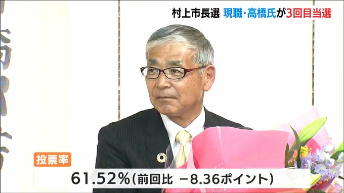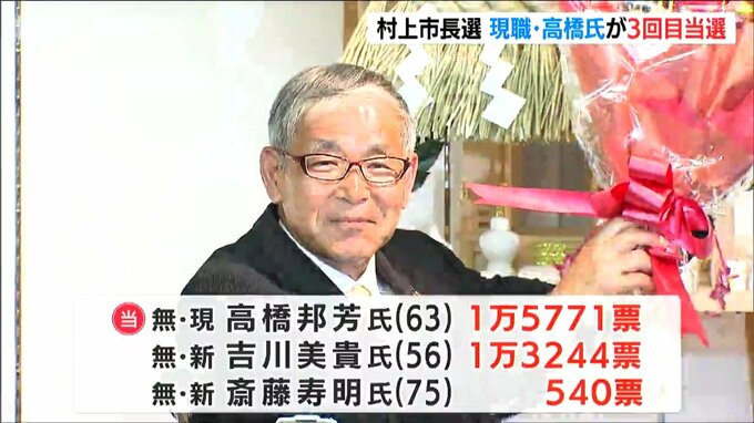 現職や新人あわせて3人が立候補した村上市長選は11日に投開票が行われ、現職の高橋邦芳さん(63)が1万5700票余りを獲得。次点の新人候補におよそ2500票差をつけて3回目の当選を果たしました。