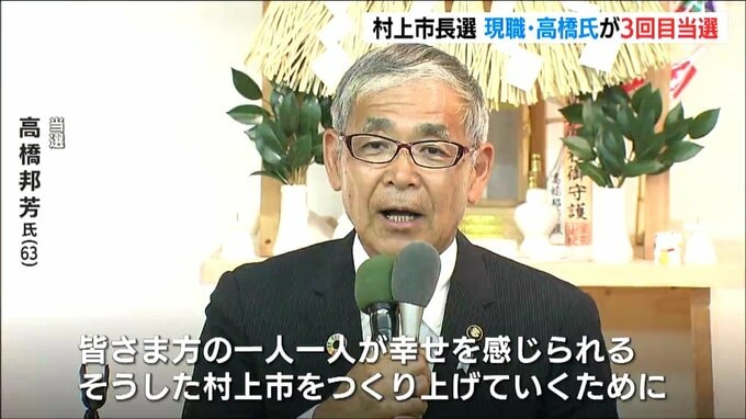 任期満了に伴う村上市長選挙の投開票が11日に行われ、現職の高橋邦芳さん(63)が3回目の当選を果たしました。