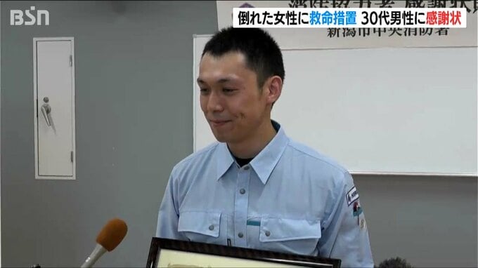 道端で倒れて心肺停止となっていた女性を救助したとして、新潟市の30代の男性に消防から感謝状が贈られました。
