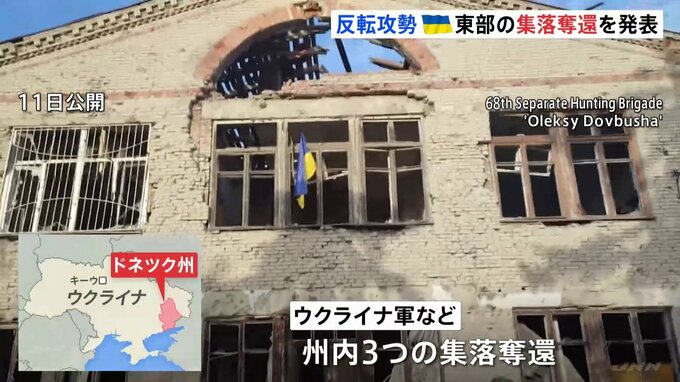 ウクライナ軍はロシア軍に対する反転攻勢が行われている東部ドネツク州にある集落を奪還したと発表しました。反転攻勢の最初の成果だとしています。「ウクライナに栄光あれ」激しく損傷した建物にウクライナ国旗を…