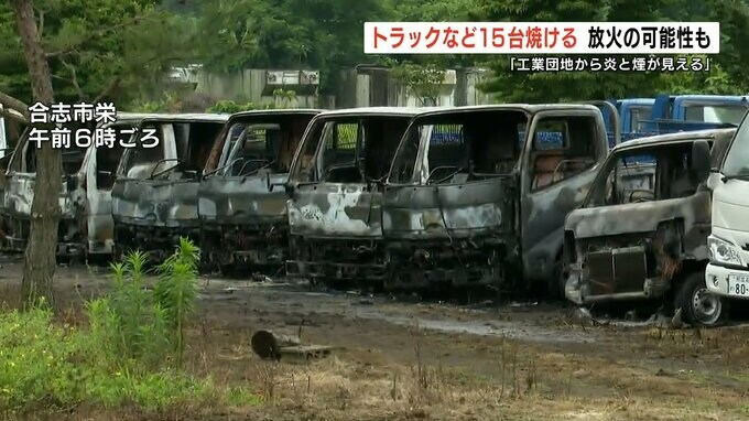 熊本県合志市で駐車場に止めてあったトラックなどから火が出て、あわせて15台が焼けました。