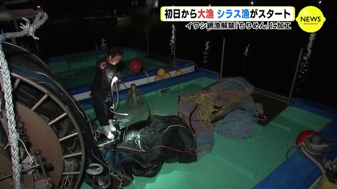 最初の網入れで水揚げされたシラスは、およそ1.2トン。初日としては例年にない大漁となりました。