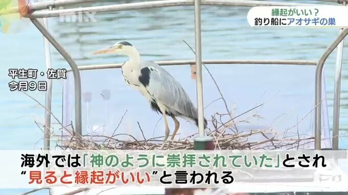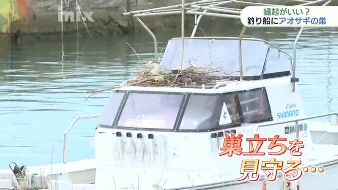 山口県平生町の漁港に係留されている釣り船に、見ると縁起がいいとされるアオサギが巣を作っています。