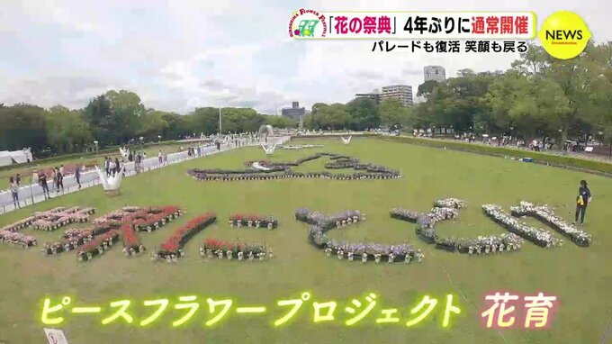 「平和公園の中にやってきました。芝生広場には、フラワーアートで、大きなハトやことしの祭りのテーマである『ここで咲く花 世界に届け』という文字が表現されています」